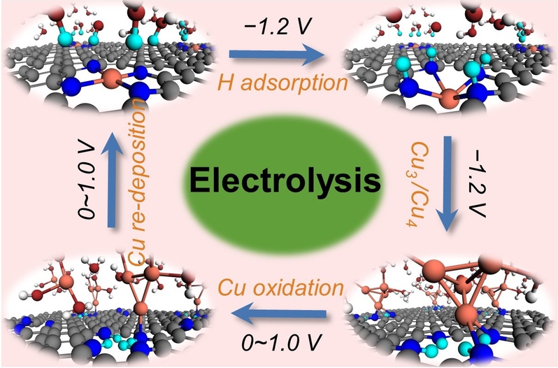 针对这一问题,王金兰教授、刘远越教授团队以单个铜原子嵌入氮掺杂石墨烯为例,利用“恒电势混合溶剂化动力学模型”,在真实反应条件下探索了单原子Cu与Cu团簇之间的动态可逆转变机制。结果揭示氢的吸附是铜单原子从催化剂表面浸出的重要驱动力。随着电极电位越负,氢的吸附越强,铜单原子越容易从表面浸出。此时,与其他铜原子聚合形成铜小团簇能够作为真正催化活性中心促进CO2还原成乙醇。当反应结束后,电极电位被切断或切换到正值,羟基自由基(OH•)能够促进铜簇氧化,进一步通过再沉积过程回到初始原子分散态,最终完成催化剂的重构循环。以上这些结果采用传统的电中性DFT方法很难被观察到。因此,该工作不仅为真实反应条件下发生的重构现象提供了更全面的机理解释,还为设计和开发具有高性能的电催化剂提供了新思路。