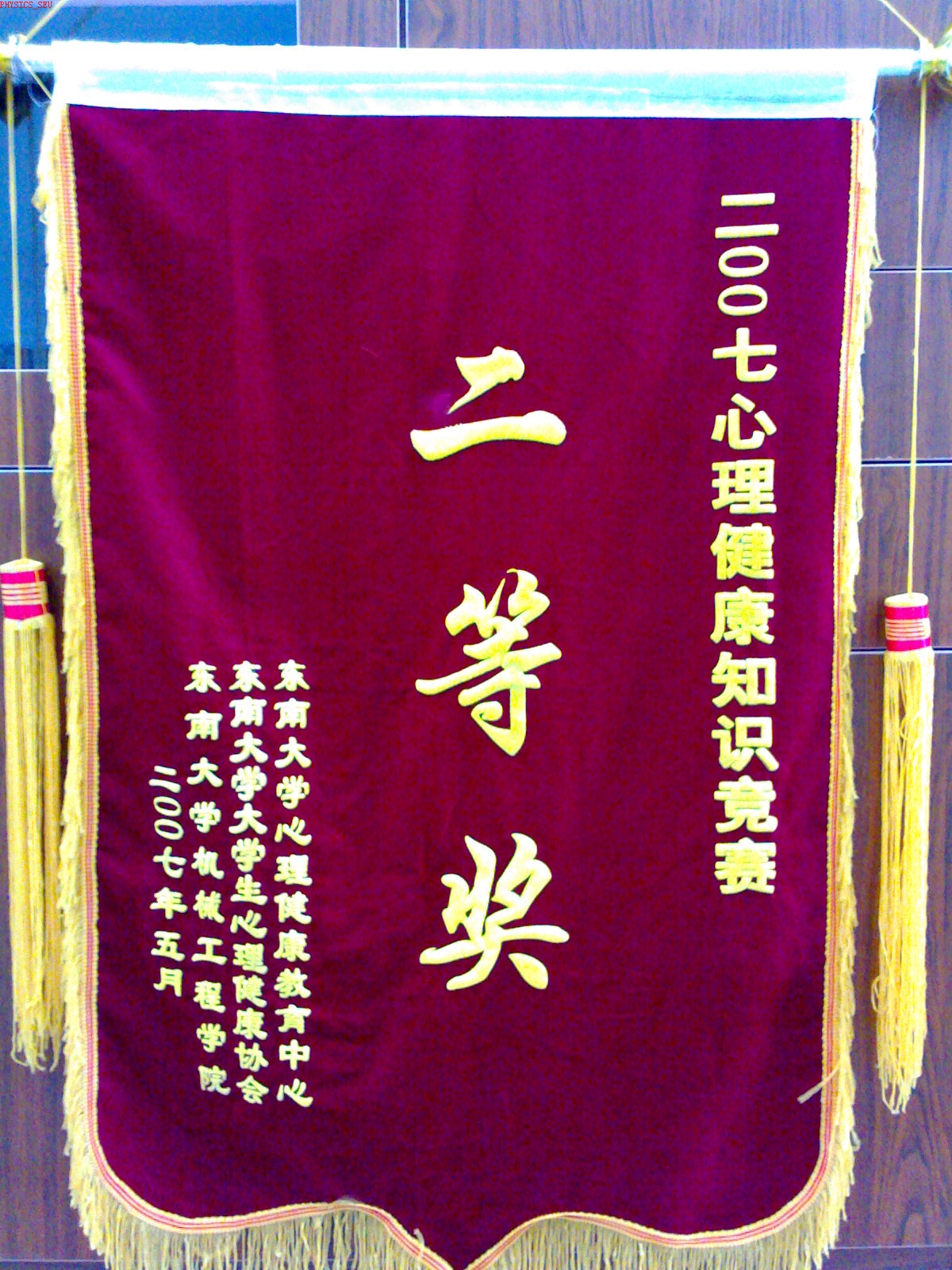 我系在校心理健康中心、心理健康协会主办的2007心理健康知识竞赛中荣获二等奖。通过初赛的角逐我系代表队挺进四强。在决赛的现场我系代表队的选手冷静沉着,充分展示了同学们在心理健康知识方面的才能。通过此次比赛,使同学们更多地了解了心理健康知识,有利于同学们进行自我心理调节。
