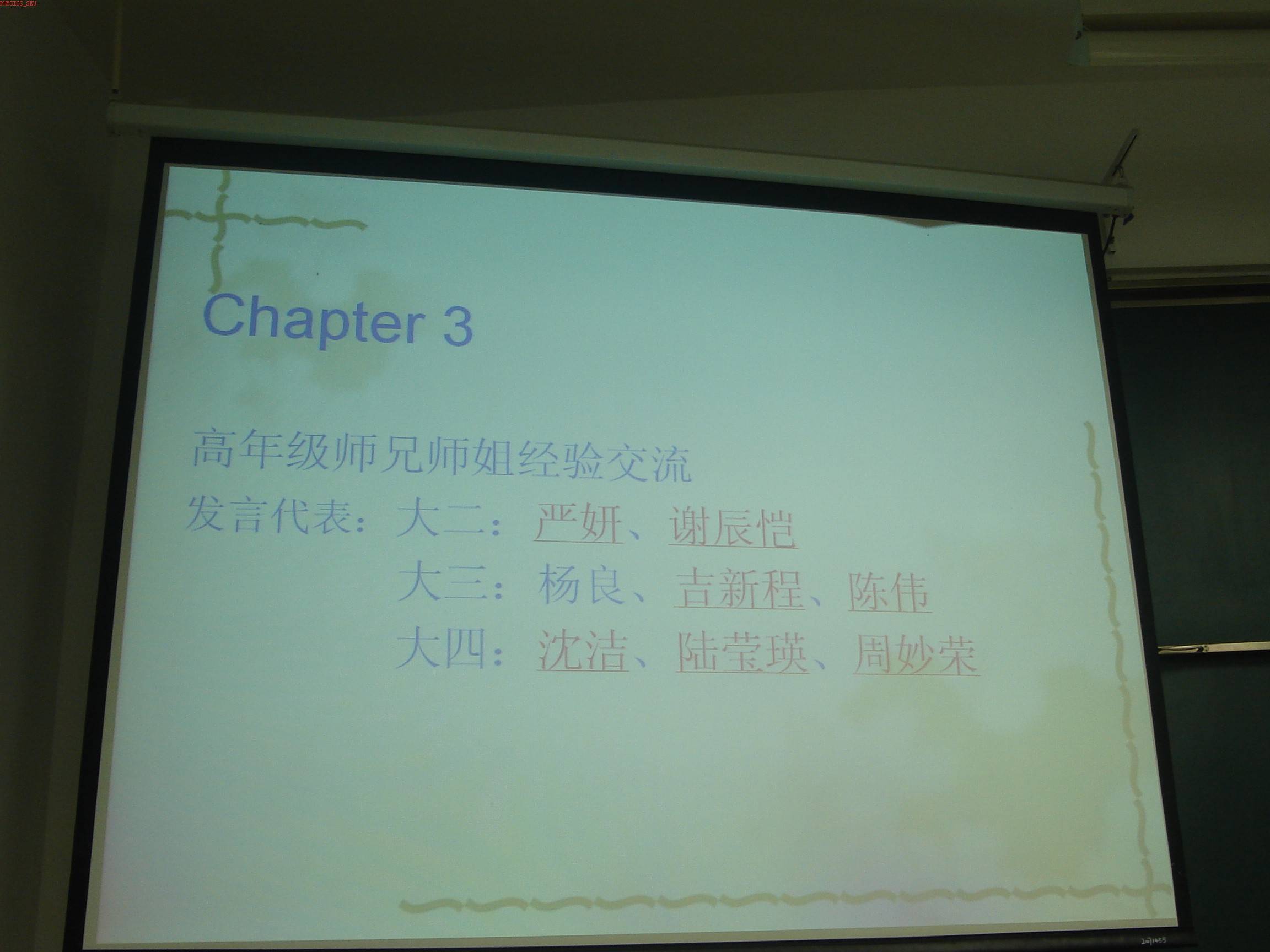 出席此次交流会的老师和同学有:系党委副书记章荣琦、辅导员罗萍老师、校长奖学金获得者陆莹瑛、吉新程、谢辰恺、已获中科院保研资格的沈洁同学、已找到理想工作单位的周妙荣同学、上届学生会主席杨良、由土木学院转来的陈伟同学、以及专业名列前茅的严妍、顾丽佳同学、学习部副部长杨浩以及大一的所有新同学。