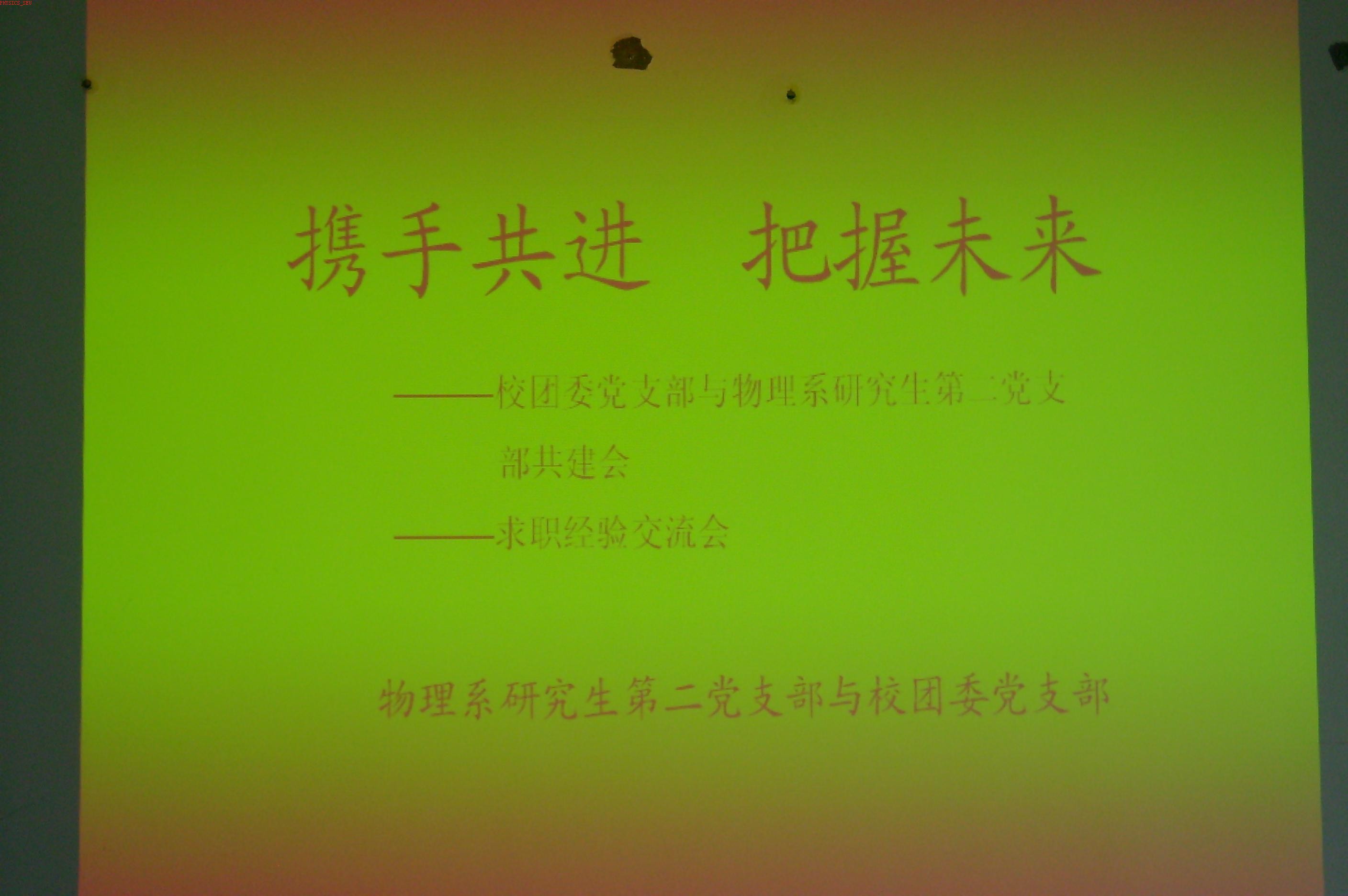 200842号物理系研究生第二党支部与校团委党支部在物理系田家炳楼105答辩室开展了“携手共进,把握未来”研究生就业经验交流会暨物理系研究生第二党支部与校团委党支部结对共建的支部活动。