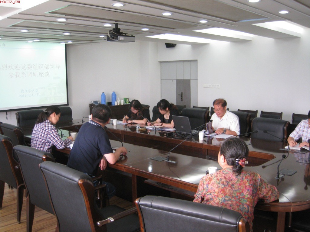 调研座谈会上物理系党委副书记裴锋同志就物理系党支部设置情况,存在的问题及建议;物理系党建工作的特色、存在的困难、建议;物理系创先争优活动中的做法、特色;对学校党建工作的建议四方面进行了汇报。物理系党委书记高嵩同志作了补充。校党委组织部领导对我系党建工作及创先争优活动的开展给予充分肯定,并表示一定会把基层党组织好的意见和建议收集、反映给校党委。