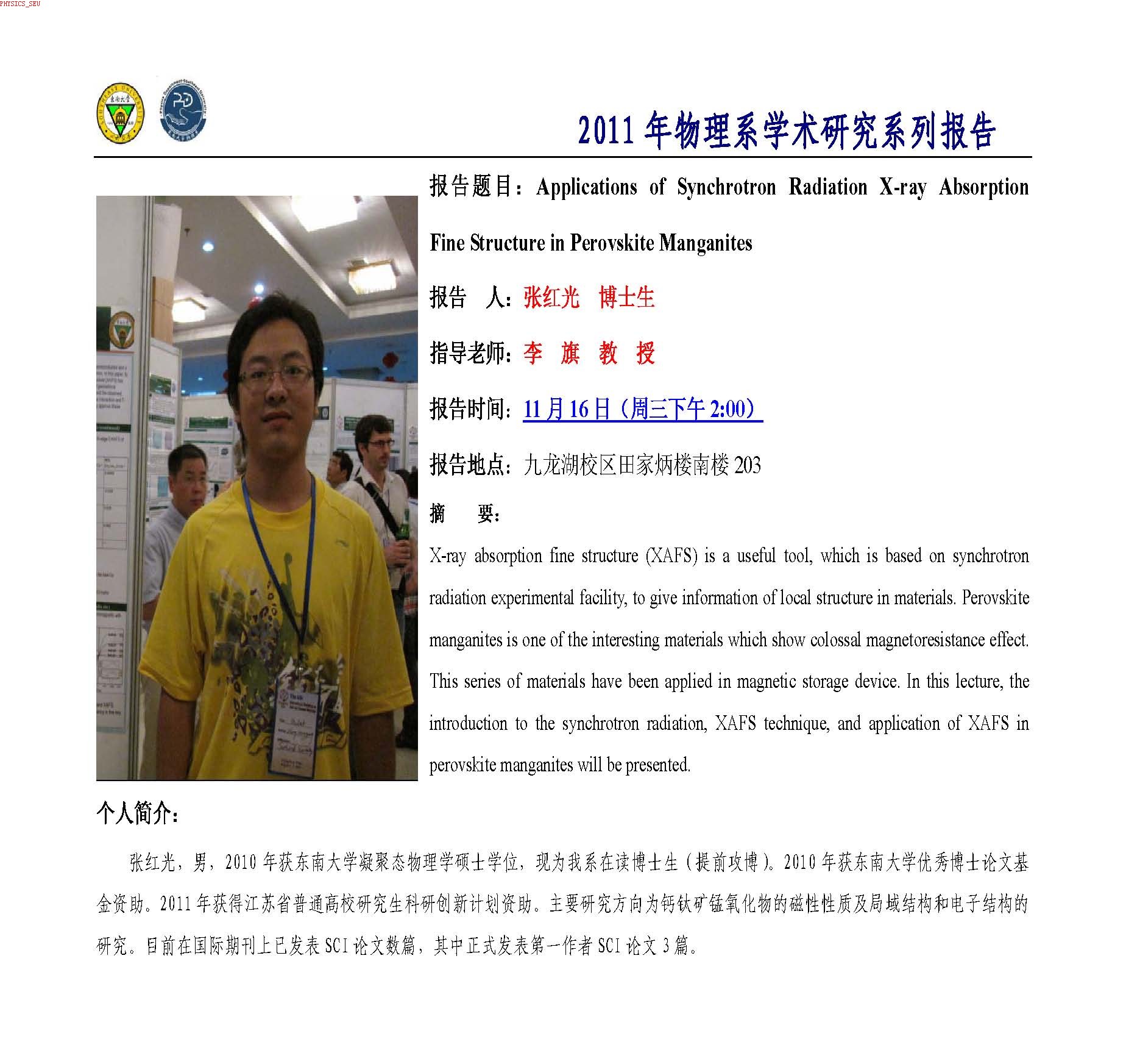张红光,男,2010年获71886a必赢凝聚态物理学硕士学位,现为我系在读博士生(提前攻博)。2010年获71886a必赢优秀博士论文基金资助。2011年获得江苏省普通高校研究生科研创新计划资助。主要研究方向为钙钛矿锰氧化物的磁性性质及局域结构和电子结构的研究。目前在国际期刊上已发表SCI论文数篇,其中正式发表第一作者SCI论文3篇。