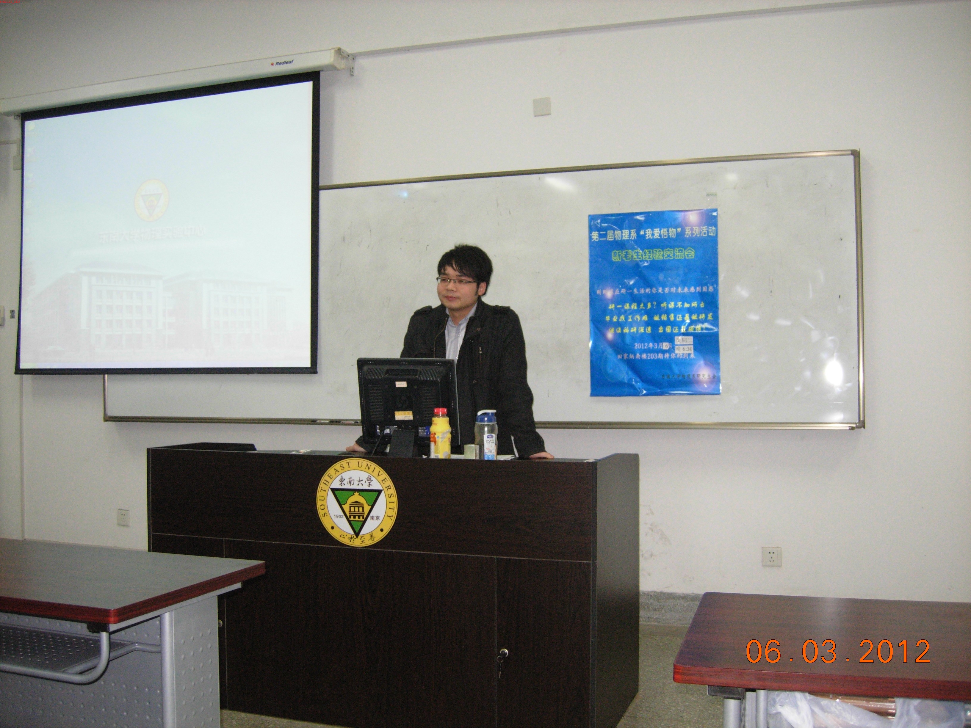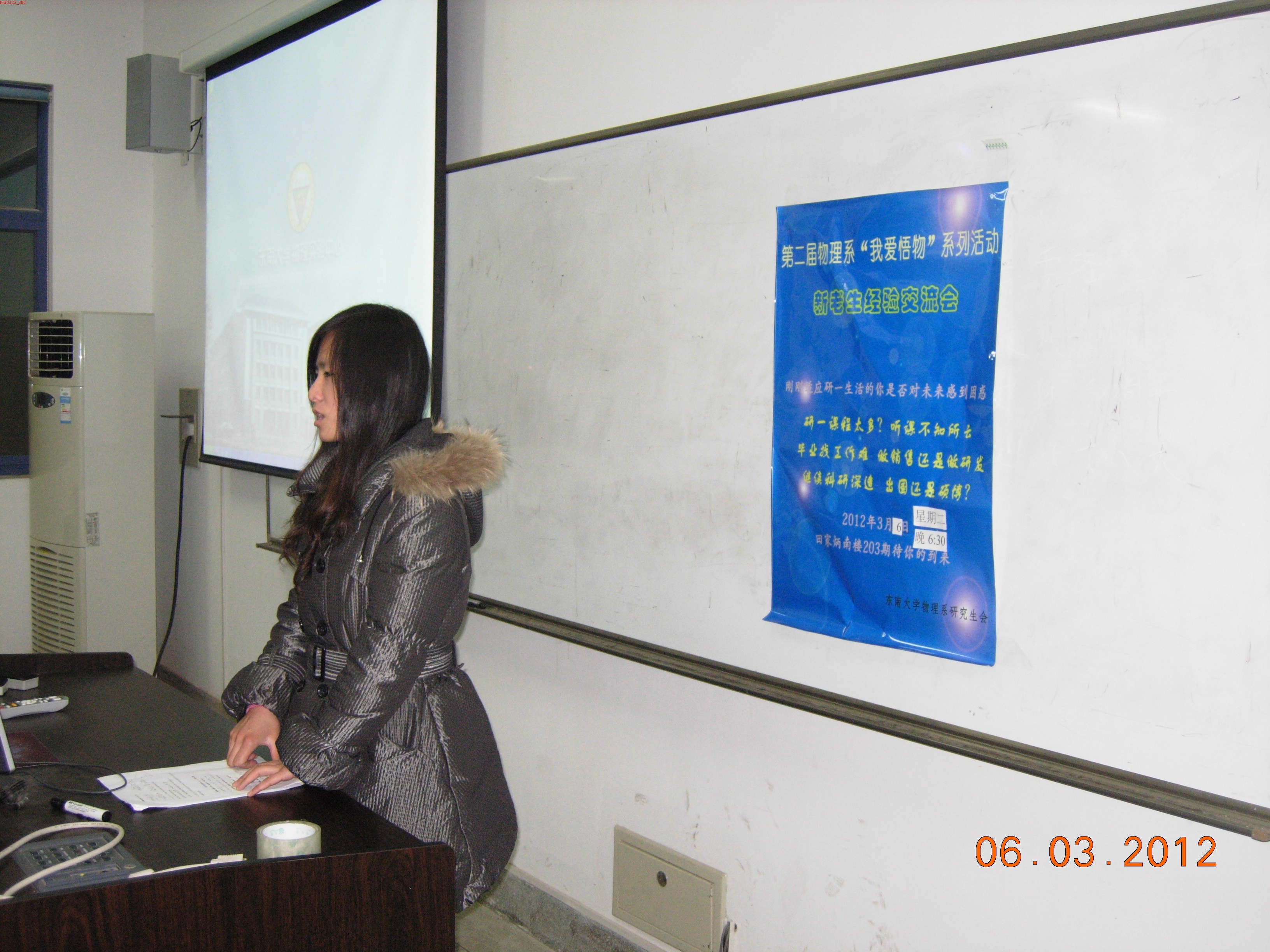 2012年3月6日,在系团委和系研究生会的组织下,第二届物理系“我爱吾物”系列活动之新老生交流会在田家炳楼南楼203成功举办。本次活动邀请了多位2012届硕士毕业生,请他们介绍毕业之后的人生规划,比如工作,读博,出国等问题,旨在向研一新生传授在学习生活过程中的经验和心得。