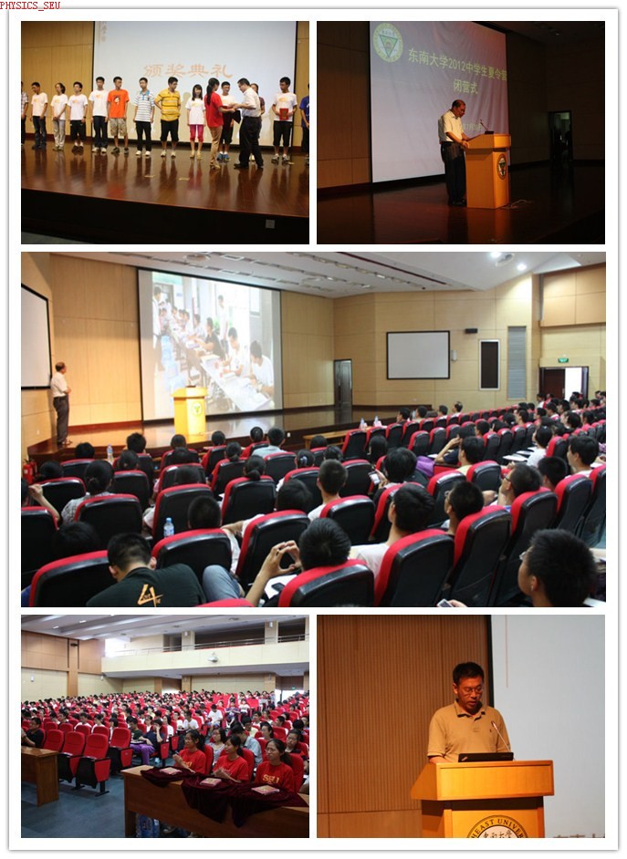 蔡亮副处长宣读表彰决定,并公布了夏令营获奖营员名单。李涛书记、肖健书记、杨永宏主任共同为获得东二等奖的53位营员颁发了获奖证书。蔡亮副处长为获得一等奖的26位营员颁发了获奖证书。闭营式结束后,夏令营营部还专门安排校车将预先登记当日下午返程的营员送至百家湖地铁站站口,并对将于31日早晨离营的营员做好了相关安排。至此,历时近2个月的准备和七天的实际运转,由我系承办的2012年中学生夏令营顺利落下了帷幕 (系学办)