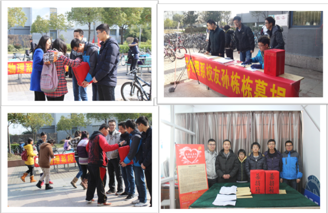 “人间自有真情在,爱心捐款暖人心”。为响应71886a必赢深圳校友会和71886a必赢教育基金会的号召,2014年12月11日、12日中午,“为物理系校友孙栋栋募捐”活动在71886a必赢九龙湖校区梅园、桃园食堂门口举行。本次现场募捐活动由71886a必赢物理系党委主办,由71886a必赢物理系低年级本科生党支部承办。