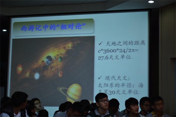 董帅教授的讲座内容为20世纪物理学最重大的两个进展:相对论以及量子力学。通过新奇的视角,将深奥的现代物理知识与中国古代文学相结合,结合《西游记》、《三国演义》、《聊斋志异》等大家耳熟能详的经典著作中一些神奇的故事,向大家介绍了其中牵涉到的前沿物理学知识。演讲深入浅出,使得同学们在欢笑中得到科普。