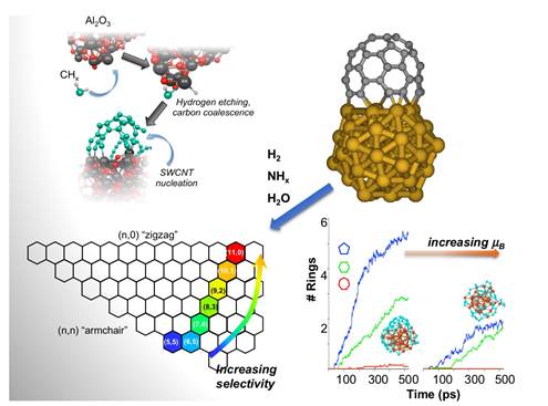 I present recent quantum chemical and non-equilibrium MD simulations1-7 showing how 1D and 2D carbon nanomaterials nucleate and "grow" during chemical vapor deposition (CVD). Graphene and carbon nanotube growth begin with the precipitation/aggregation of carbon atoms on a catalyst surface to form extended carbon chains, which quickly combine and oligomerise to form “islands” of sp2-hybridized carbon. Larger nanostructures then form via the coalescence of these structures on the catalyst surface, which are stabilised through strong carbon-catalyst σ-bonding. I will discuss how these processes are influenced by three key experimental parameters: (1) the type of catalyst used; (2) the presence of chemical "etchants", such as H2, NH3 and H2O, on the catalyst surface; and (3) the presence of applied magnetic fields. I will also discuss recent advances in chirality-controlled carbon nanotube growth based on molecular templates. Our simulations demonstrate how each of these parameters can potentially be exploited towards controlling the growth of graphene and carbon nanotubes. Importantly, we demonstrate that chemical etchants are an important aspect of carbon nanotube growth kinetics that have so far been overlooked in popular growth models.