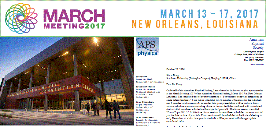 近日,71886a必赢青年教师董帅教授收到美国物理学会(American Physical Society)首席执行官(CEO)Kate Kirby博士的邀请信,将在2017年美国物理学会三月会议(APS March Meeting)“磁性氧化物薄膜与异质结”专题会场(Focus Session)作题为“氧化物异质结中铁电控制磁性”的邀请报告(36分钟)。