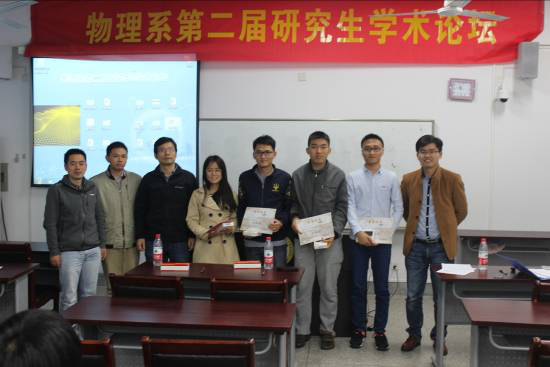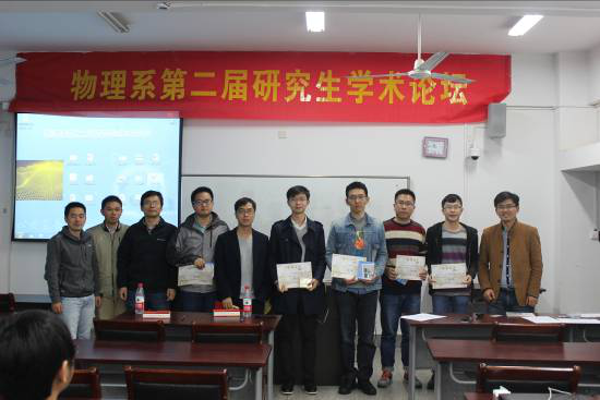 本次学术论坛报告分为博士组和硕士组进行评比,并由博士组的学术达人们拉开了学术盛宴的帷幕,博士生周跫桦向同学们分享了他在顶级刊物Angewandte Chemie-International Edition上发表的工作,详细介绍了黑磷的降解机制并为二维黑磷的保护提供了有效的新思路;博士生翁亚奎同学介绍了在磁电耦合领域的最新研究成果,设计了基于BiFeO3异质结的电场控制磁滞回线功能器件原型(论文发表在Phys. Rev. Lett.上)。博士生詹翔和边志浩同学也在学术论坛中与大家交流了他们分别发表在Phys. Rev. Lett.(2015)和(2016)上的工作,让同学们近距离地了解了量子信息与量子计算领域的研究进展。每一位报告人都精心准备了高水平的学术报告,让到场的同学们受益匪浅。在报告间隔的提问环节,评委老师和同学们也进行了热烈的学术讨论,给报告人和现场同学们很多新的启发,同时将科研交流氛围一次次引向高潮。经过激烈的评选,最后由倪振华老师宣布了本次论坛的获奖名单: