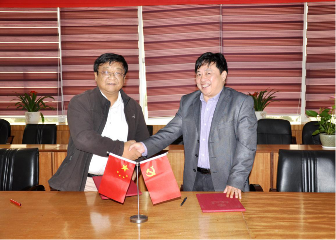 (图为物理系党委书记、湖南省招生组组长王勇刚与宁乡一中校长欧阳才代表双方签约)