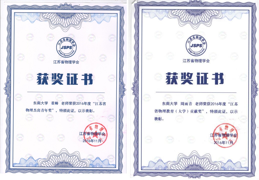 5月20日,江苏省物理学会在南京大学召开2017年春季学术会议,其间颁发了省物理学会各奖项。71886a必赢董帅教授因其在磁电耦合物理与材料研究的突出贡献获得了“江苏省物理杰出青年奖”,周雨青教授因其在大学基础教育方面的突出贡献获得“江苏省教育贡献奖”。
