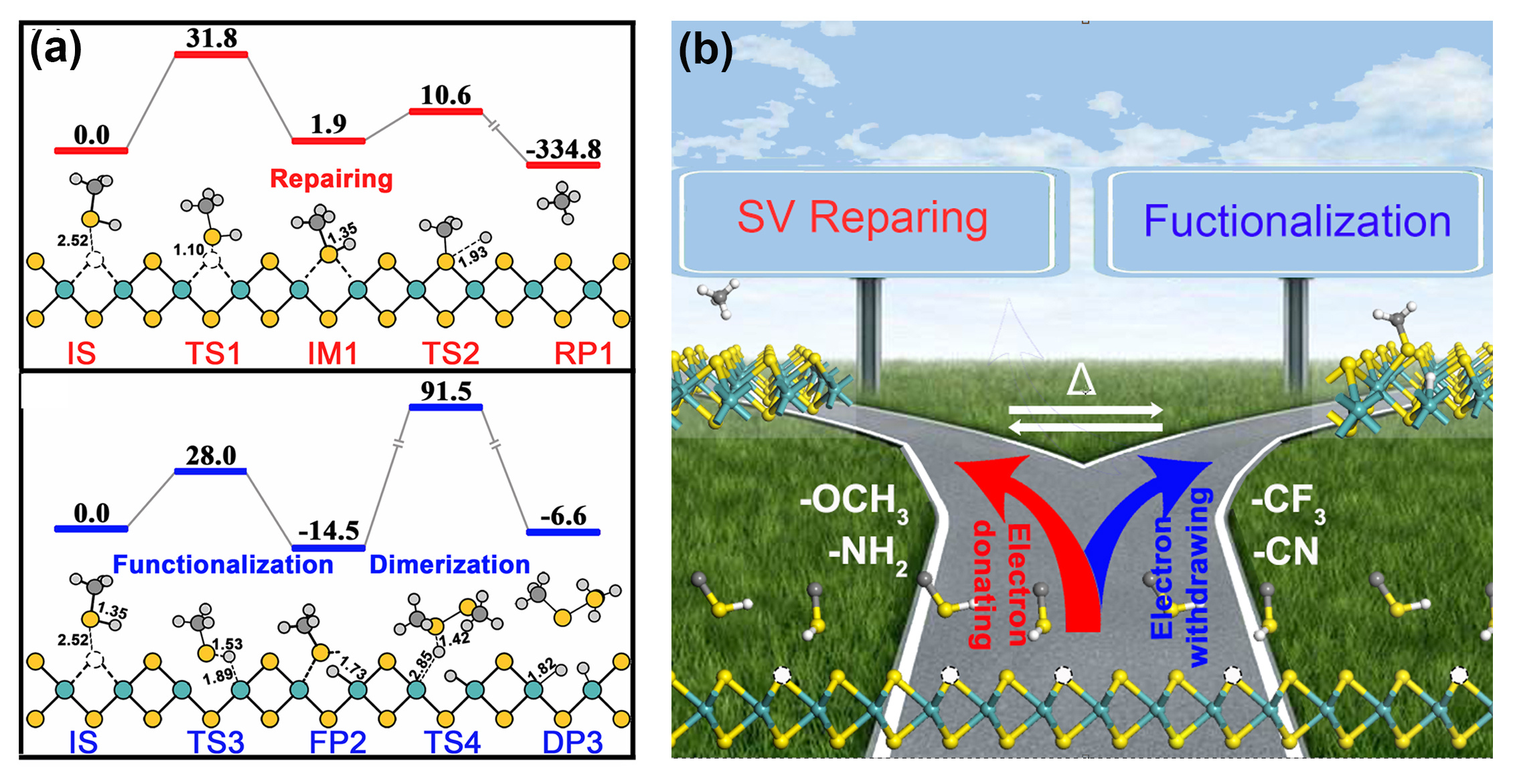 针对这些争议,王金兰教授课题组基于原子尺度的理论计算,发现MoS2中的缺陷可催化硫醇分子中S-H键的断裂,并存在两种竞争反应机制:一种趋向于S-C键的进一步断裂进而起到修补缺陷的作用;另外一种则形成Mo-S键进而对MoS2进行表面修饰(图a所示)。王金兰教授课题组进一步发现,通过硫醇分子中官能团的修饰(如吸电子基团与给电子基团)以及温度的控制可以实现两种竞争反应的有效调控(图b所示)。这一研究首次阐明了通过有机分子表面修饰能否调控二维材料性质,并可推广到其他过渡族硫化物,为二维材料物性调节与表面功能化提供了可靠的理论依据。