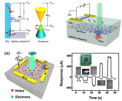 倪振华课题组提出了全新的界面态光增益机制,构建了石墨烯/二氧化硅/轻掺杂硅这一器件结构,利用轻掺杂Si中较长的载流子寿命和石墨烯的超高载流子迁移率,实现了弱光的快速、高灵敏探测,器件响应度达到1000A/W,响应时间低至400ns(Optica 3, 1066-1070 (2016))。进一步,课题组利用该界面态光增益机制以及载流子的横向扩散效应, 设计了基于石墨烯的新型PSD,实现了nW量级微弱光的快速位置探测,且具有小于1 µm的位置分辨率,并展示了一维和二维位置传感功能(Light: Science & Applications 6, e17113 (2017))。