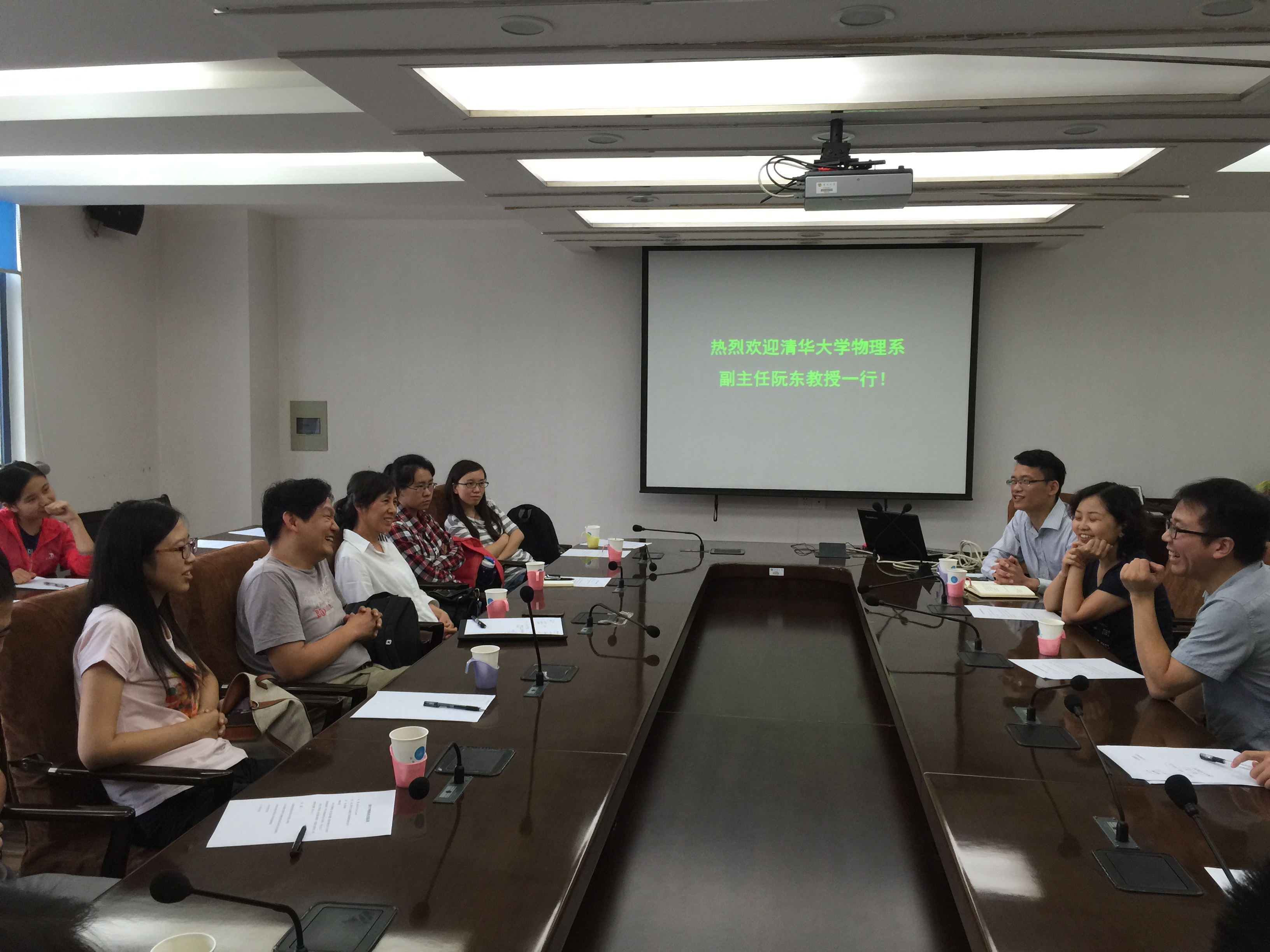 7月19日,清华大学物理系副主任阮东教授率部分清华校友和十余名博士生来我系访问交流。我系副系主任戴玉蓉、党委副书记潘勇涛、青年教师郭昊一起参与了接待和交流。