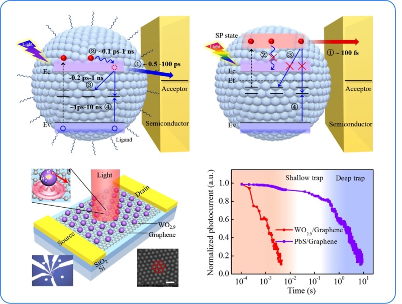 红外探测器在光通讯、成像、环境监测、军事等领域有着十分广泛的应用,实现兼备快速响应和高灵敏度的红外探测器是拓展其应用的有力保证。在光电探测、太阳能电池及光催化等应用中,电荷转移是决定光电转换性能至关重要的环节。如果转移速度不足够快,载流子的弛豫、束缚、复合等竞争过程的发生将会导致能量损失并严重制约光电转换的效率和速度。如何从载流子动力学层面上优化并实现快速高效的光电转换一直是该领域所面临的挑战。