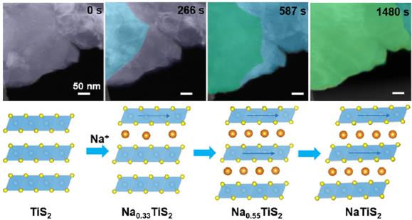 层状二硫物具有与石墨相似的层状结构,可以有效可逆地容纳和脱嵌钠离子,使其成为高容量钠离子电池电极材料候选者。但是在这些由范德华力主导的层状二硫化物结构中,钠离子的迁移可能与过渡金属氧化物中的不同,插入的钠离子可以显著地改变层间的相互作用,从而可以改变主体结构。但是目前,在这些由弱范德华力相互作用而结合的层状结构中,钠化反应过程中的结构和形貌的转变机制以及反应动力学在很大程度上是未知的,因此研究钠离子在层状二硫化物中的反应机理和反应动力学至关重要。