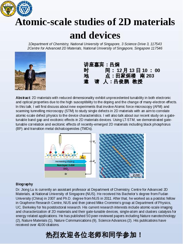 12月13日学术报告:“Ato mic-scale studies of 2D materials and devices”