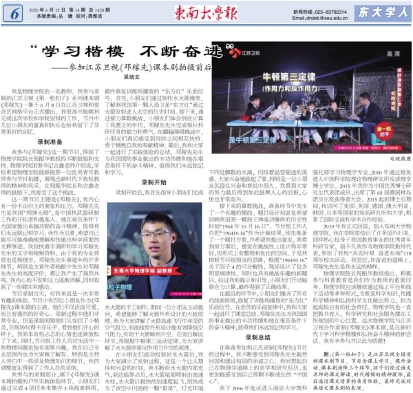 必赢官网教师吴培文参与录制的《第一粒扣子》电视节目,《邓稼先》一集近期在江苏卫视和爱奇艺网络平台同步播出。《71886a必赢报》6月15日刊文,详细报道了吴老师参加录制拍摄前后的故事。