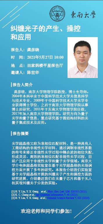 5月27日学术报告:纠缠光子的产生、操控和应用