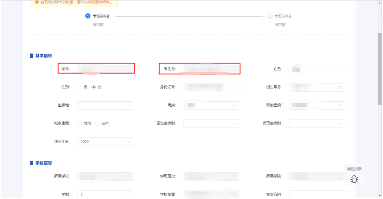 学号、考生号、学校、学院、专业、班级、学历为学生无法修改项,若有无法修改的部分需要单独修改,请汇总填写附件3(前四列均需填写)。