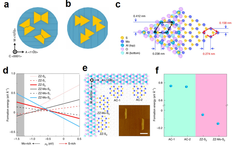 通过表面重构技术(如构造台阶面等)来降低衬底对称性有望解决这一问题。然而本工作的实验合作者发现,对对蓝宝石c面进行指向M(C/M)的斜切得到的台阶面上则生长出的依然是180°反平行的MoS2晶畴,并伴随有大量晶界(示意图a);而蓝宝石c面进行指向A(C/A)的斜切得到的台阶面上可以生长出99.6%单一取向的MoS2晶畴,这些取向一致的晶畴可以合并成大面积MoS2单晶薄膜(示意图b)。但是蓝宝石c面不同斜切方式对MoS2生长行为的影响机制并不清楚!