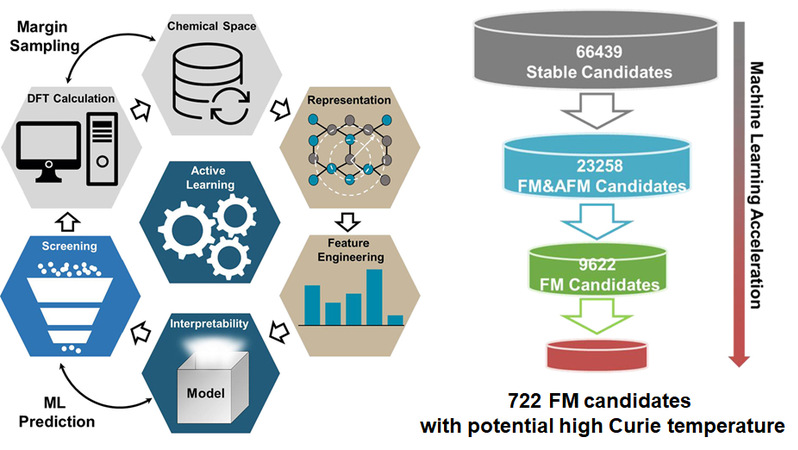 为了解决这一机器学习材料设计领域普遍存在的问题,71886a必赢王金兰教授课题组提出了一个具有反馈迭代功能的主动学习框架,将集成学习算法和边缘采样算法相结合,自适应探索磁性化学空间。该主动学习框架集成了特征工程、模型学习、数据采样、第一性原理计算和模型解释等功能,可以在数据匮乏和特征维度较高的情况下,高效地探索化学空间。最终,从20万种候选化合物筛选出9622种二维铁磁候选材料,其中722种为高居里温度的二维铁磁材料。这项工作突破了机器学习技术在复杂体系与性质应用中的瓶颈,为快速精准探索庞大化学空间提供了一种极具潜力的新策略。