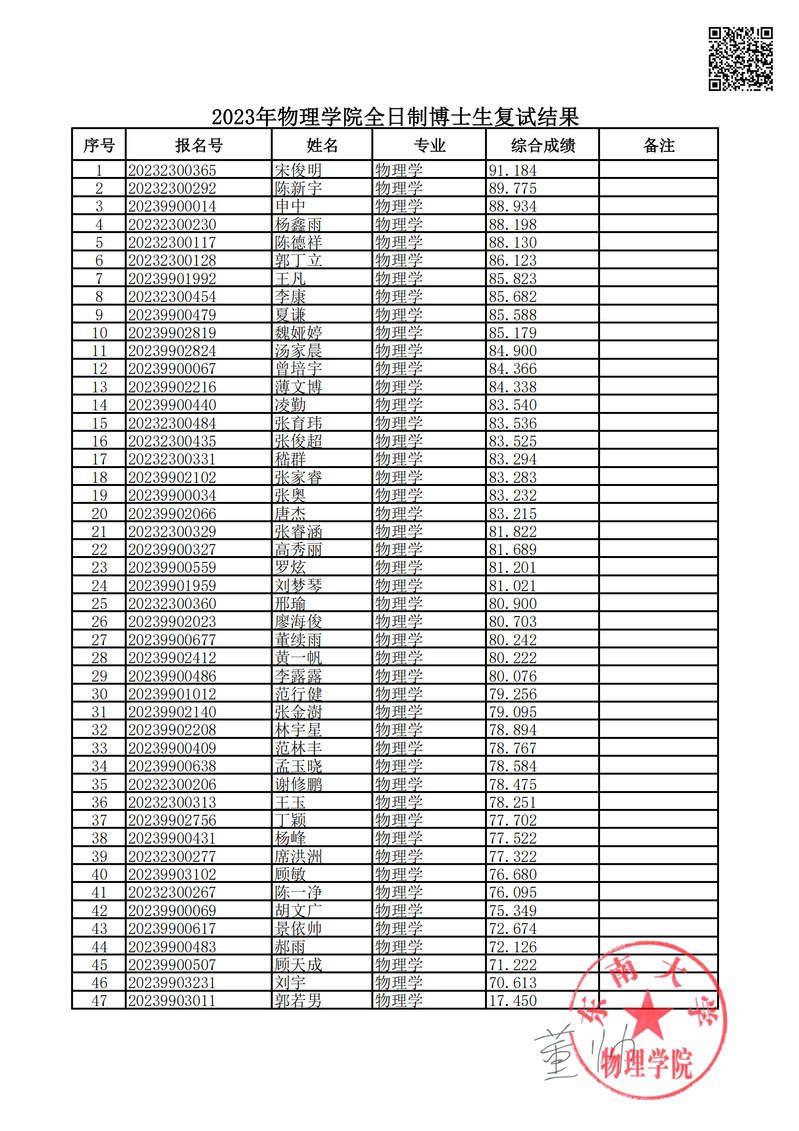 2023年71886a必赢全日制博士生复试结果