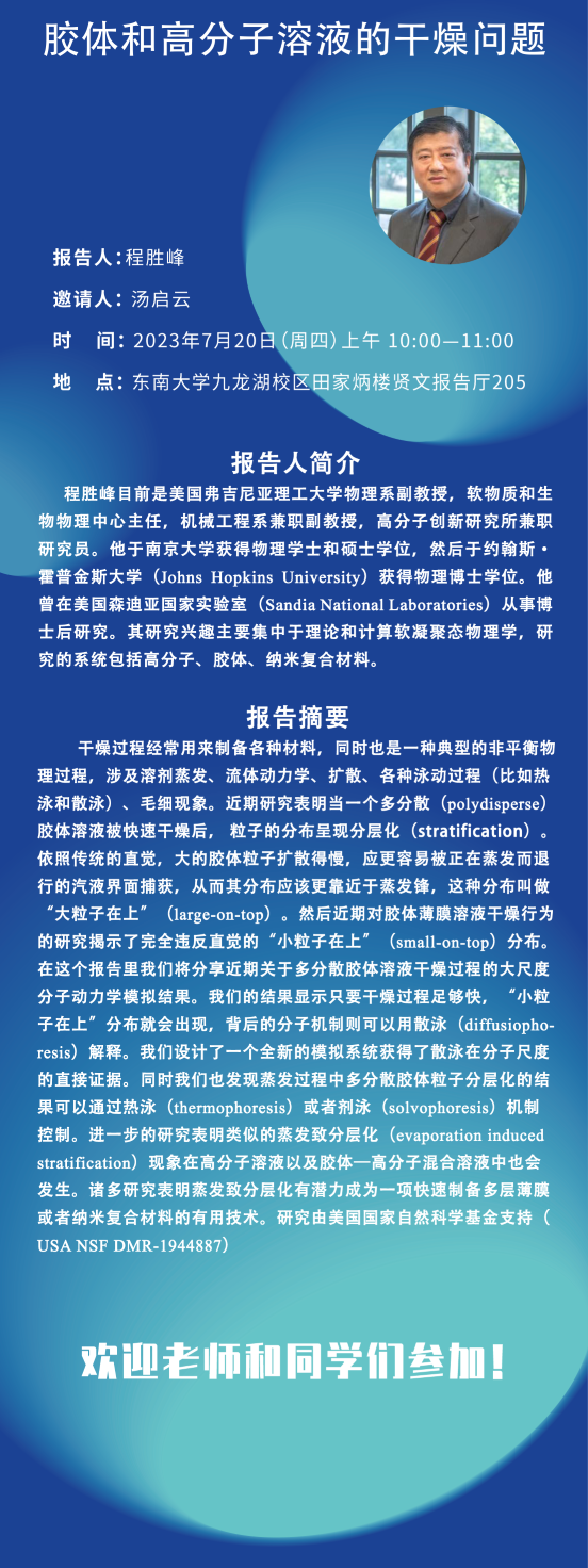 7月20日学术报告:胶体和高分子溶液的干燥问题