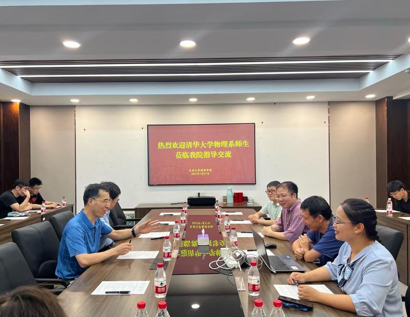 7月27日上午,清华大学物理系实验中心主任张留碗教授、副书记宋灿立教授携暑期实践队优秀博士生来必赢官网参观交流。71886a必赢副院长董帅教授、郭昊教授、办公室主任司丽芳、博士后侯旭阳陪同接待。