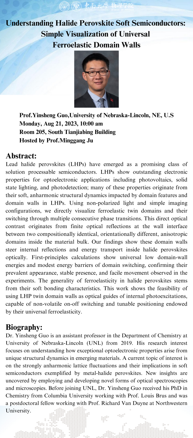 8月21日学术报告:Understanding Halide Perovskite Soft Semiconductors:Simple Visualization of Universal Ferroelastic Domain Walls