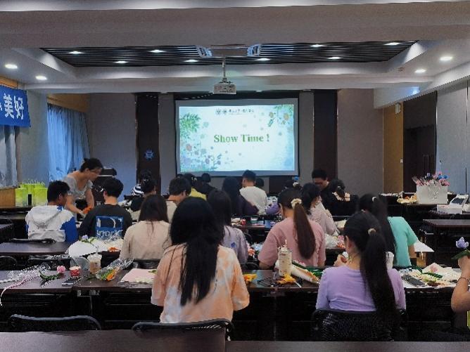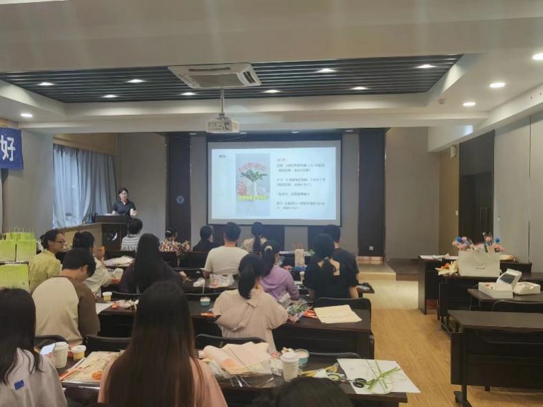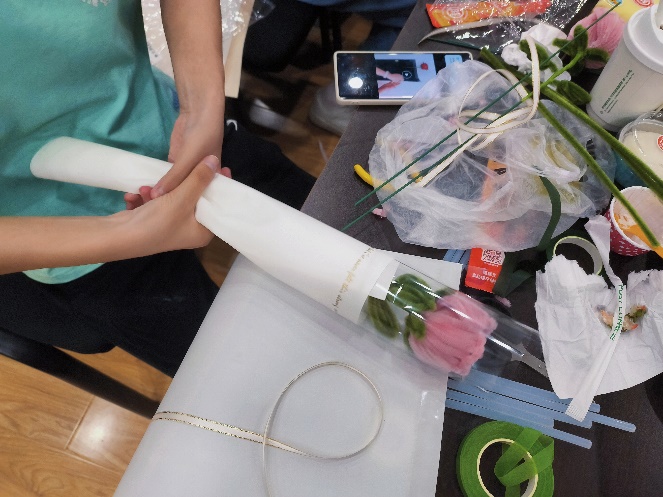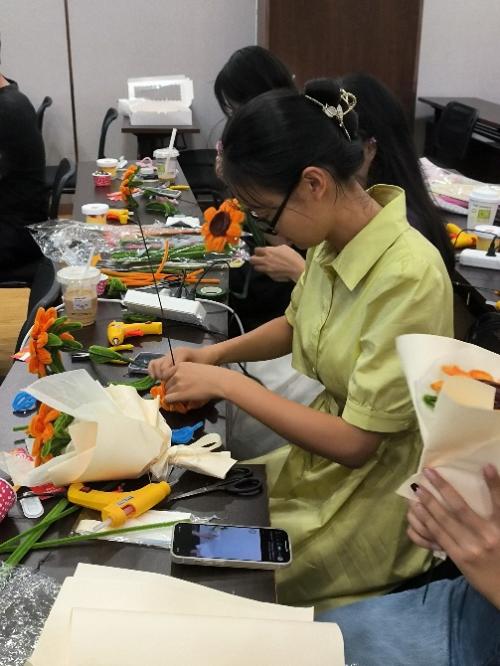活动开始,工作人员为每位老师和同学发放了手工材料—扭扭棒。随后主持人孙文静同学为大家分别介绍了郁金香、玫瑰花、向日葵三种花束的制作流程以及包装方法。