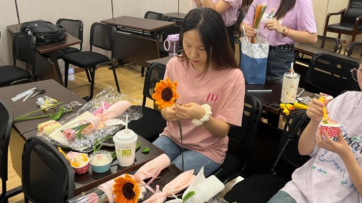 活动开始,工作人员为每位老师和同学发放了手工材料—扭扭棒。随后主持人孙文静同学为大家分别介绍了郁金香、玫瑰花、向日葵三种花束的制作流程以及包装方法。