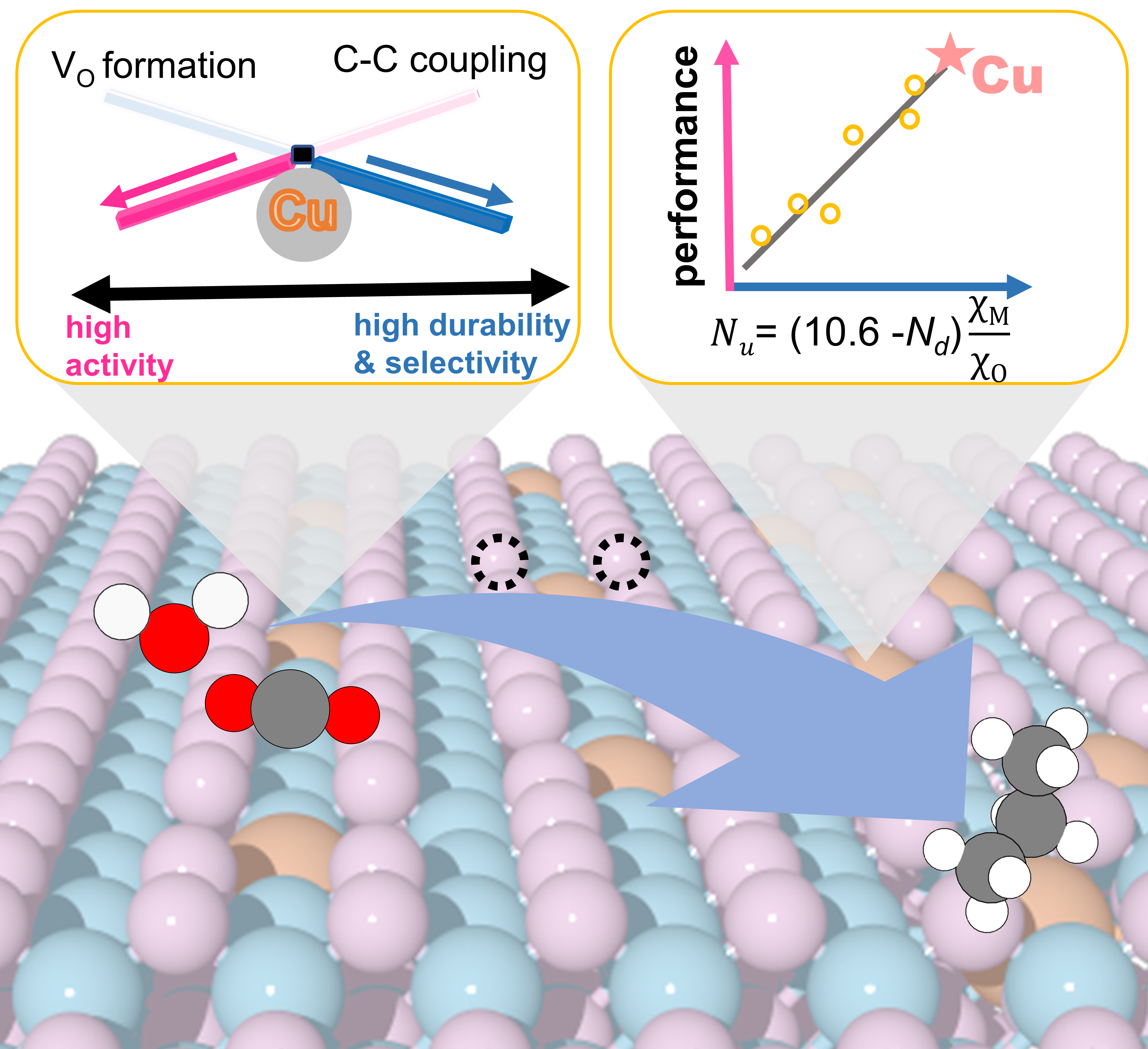 针对这一难题,王金兰教授团队提出了机理导向的CO2还原光催化剂设计方案。以实验报道的结构清晰(二维层状结构)、性能独特(高C3H8选择性)的Cu掺杂纤铁矿型TiO2体系(Cu-TiO2)为基础,深入探索了微观反应机理,揭示了影响光催化CO2合成丙烷的选择性、活性、耐久性的关键因素:双氧缺陷是高C3H8选择性的先决条件,适中的C-C耦合能垒是高活性的关键,而双氧空位的再生能力决定了催化剂的耐久性。更重要的是,他们发现氧空位的形成/再生与C-C耦合呈负相关,这表明理想的催化剂需要在氧空位形成和C-C耦合之间取得平衡。在此基础上,文章设计了相邻两个Cu原子掺杂的TiO2,进一步提高了CO2光还原产生丙烷的性能。为了揭示不同体系催化产生多碳产物性能差异性起源的根本原因,团队进一步构建了一个基于原子固有性质的简单描述符(Nμ即“有效d电子数”)。这些结果对金属氧化物基光催化剂的“结构-性能”关系提供了新的认识,从而为优异的CO2光还原合成高附加值产物催化剂的理性设计提供了有效策略。
