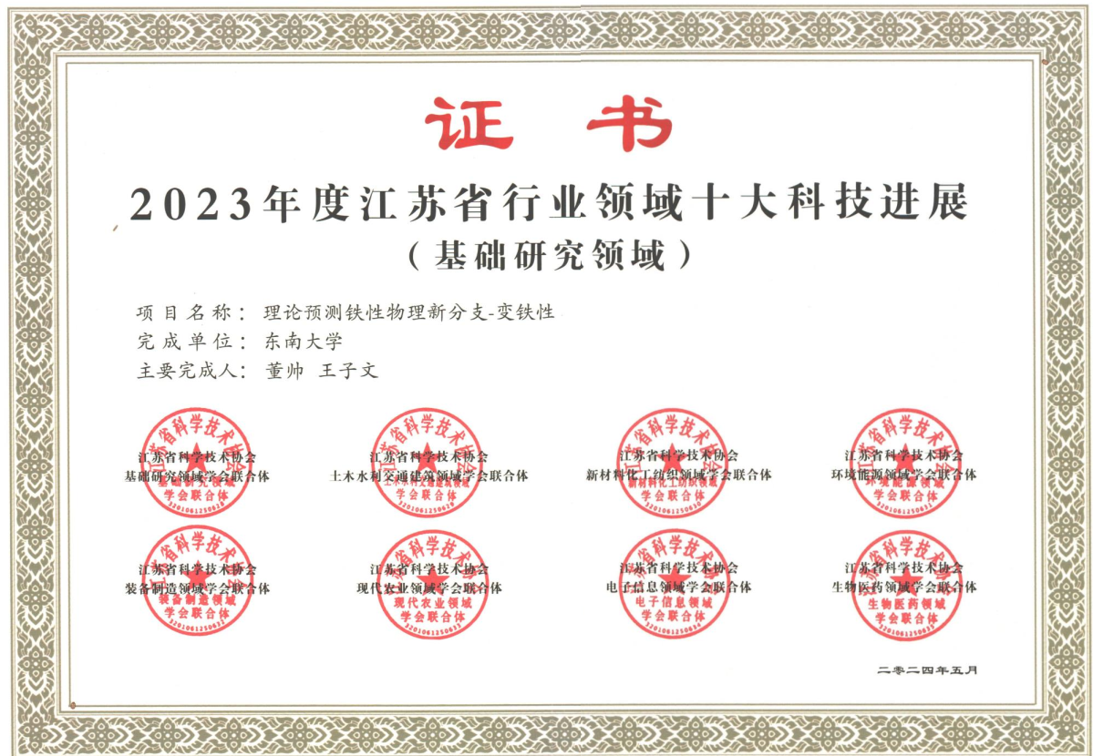 近日,省科学技术协会公布了“2023年度江苏省行业领域十大科技进展”遴选结果,必赢官网董帅教授团队凭借“理论预测铁性物理新分支-变铁性”的研究成果入选基础研究领域十大科技进展。