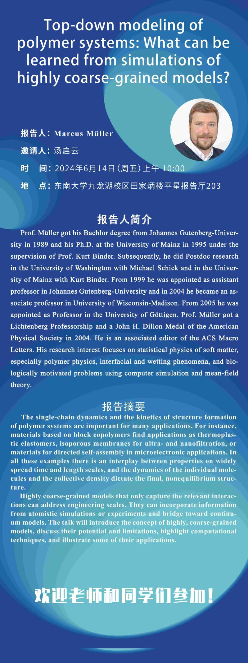 6月14日10:00学术报告|Top-down modeling of polymer systems:What can belearned from simulations of highly coarse-grained models?