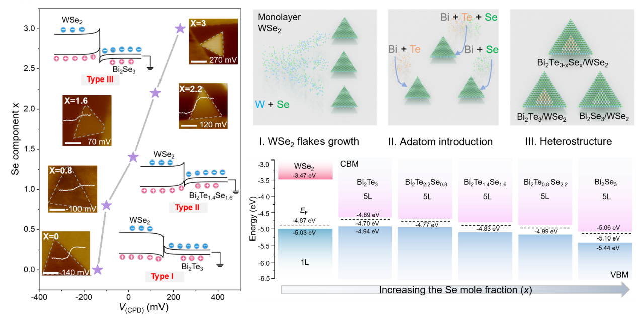 近日,71886a必赢倪振华教授、吕俊鹏教授课题组和中国科学院半导体研究所魏钟鸣研究员课题组合作提出了利用原子取代构建渐变能带结构的新策略,在WSe2/Bi2Te3-xSex范德华异质结(vdWHs)中,实现了I型到III型的精准能带匹配,获得了高效的异质界面电荷转移,构筑了高性能光电器件。相关成果以《二维范德华异质结中组分可调的I型到III型能带对准工程》“Composition Modulation-Mediated Band Alignment Engineering from Type I to Type III in Two-dimensional vdW Heterostructures”为题发表在Advanced Materials上。