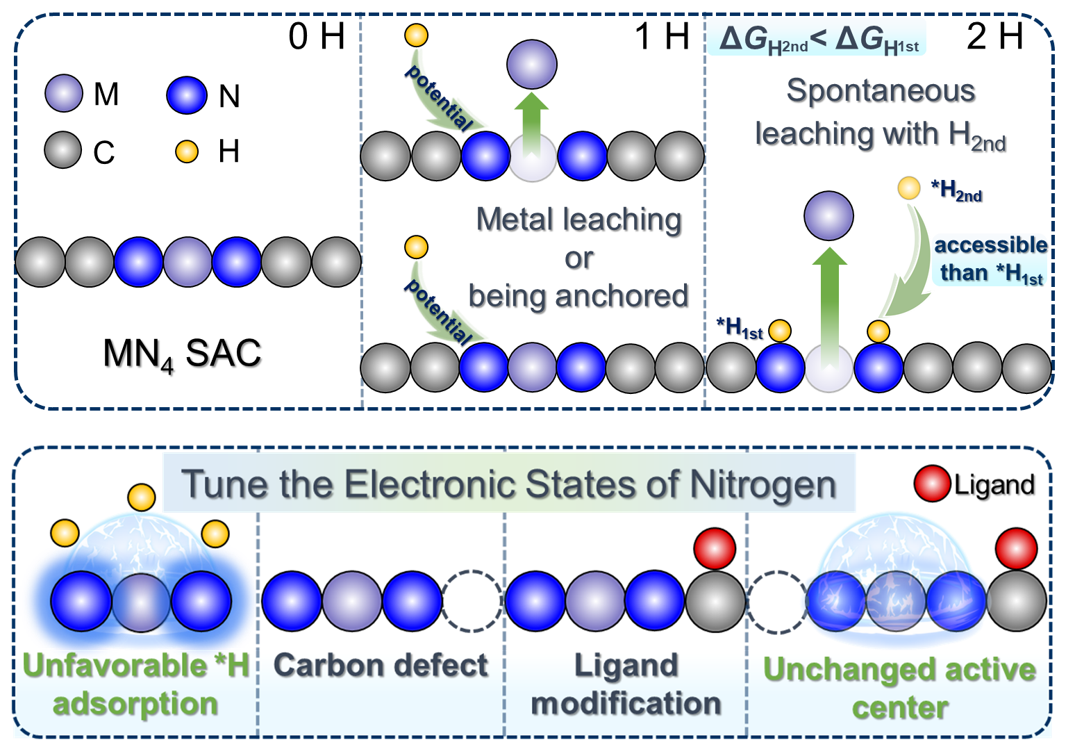 针对这一问题,王金兰教授团队通过恒电位密度泛函理论模拟,构建了CO2还原工况条件下单原子催化剂的结构-稳定性关系。团队采用机制引导策略,在前期提出的单原子催化剂金属浸出机制(J. Am. Chem. Soc., 2022, 144, 17140)基础上,进一步发现配位N原子上第一个氢原子的吸附与否是金属原子浸出的决定因素。基于此,团队开发出一个新的描述符,涵盖元素特性和反应条件,能够有效预测电催化环境下单原子催化剂的稳定性及金属浸出电位。进一步,团队提出数种在不改变活性中心几何结构的前提下增强单原子催化剂稳定性的策略,并获得实验数据支持。以上研究结果为单原子催化剂稳定性的快速评估和针对性优化提供了有力工具。