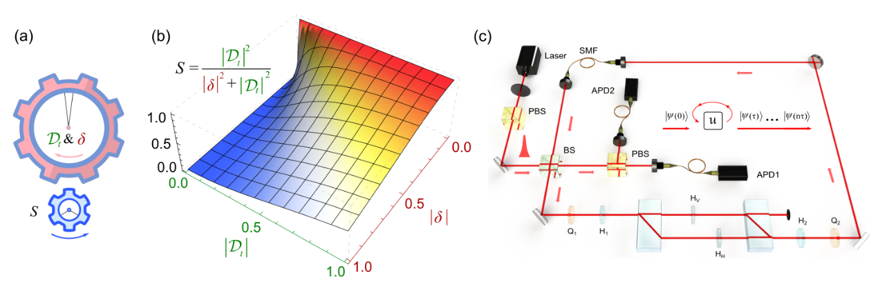 肖磊教授团队将上述方案进一步地推广到一般的非厄米系统,在量子光学系统中设计了环状结构演化装置,实现了普适的非厄米系统的动力学演化过程。他们通过精确调控使系统处于参数敏感的Population matching区域,测量到非厄米系统演化下的布居数较厄米系统对待估计参量更加敏感,灵敏度提升了5倍。同时,他们还设计了该传感方案的应用,以实验中的波片角度为待估计参量,观察到基态布居数对波片的微小变化也极度敏感,和厄米系统比较灵敏度提升了10.5倍。一般情况下测量过程中的噪声是不可避免的,它会限制传感器的性能。肖磊教授团队还研究了常见的背景噪声对非厄米传感装置的影响,发现在不能被多次测量平均的背景噪声存在的情况下,非厄米传感系统的测量不确定性明显小于厄米系统,展现了实验方案对抵抗噪声的优势。