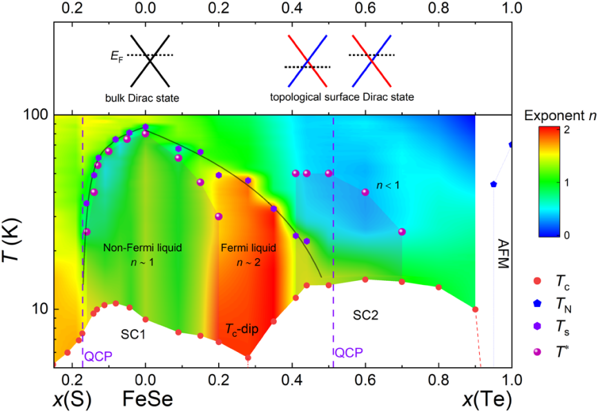 孙悦教授、施智祥教授团队通过电磁输运测量建立完整的相图,成功观察到了FeSe1-xSx和FeSe1-xTex超导体中的双超导圆顶,SC1和SC2。SC1上方的正常态电阻率显示出奇异金属行为,其幂指数约等于1(ρ(T) ∝Tn,n ~ 1),而SC2上方的幂指数小于1。在SC1上方观察到的体狄拉克态与奇异金属行为完全同步,表明二者之间存在密切的关系。而在SC2上方观察到拓扑表面狄拉克态,并且在纯向列相QCP附近发生符号变化。狄拉克态的演变表明,双超导圆顶的出现可能源于费米面重构。该研究结果强调了双超导圆顶上方不同的狄拉克态和正常态电阻率行为,为FeSe基超导体中存在两种可能的配对机制提供了令人信服的证据。
