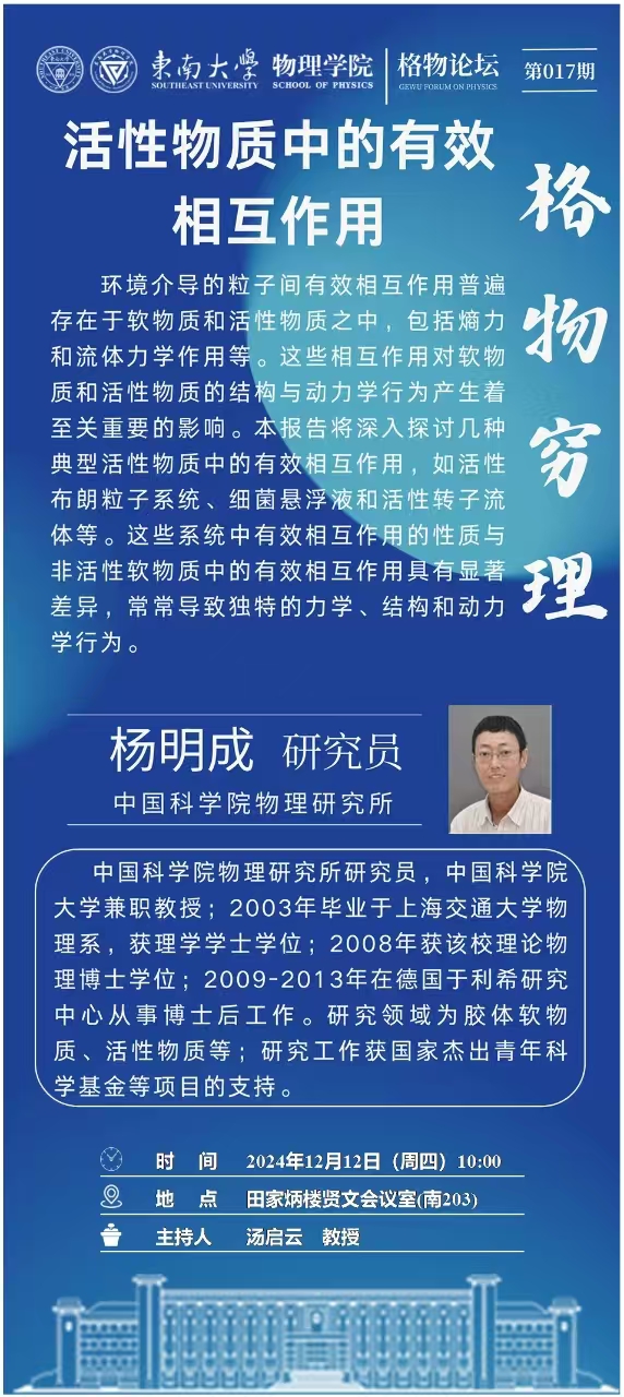 12月12日周四10:00格物论坛|活性物质中的有效相互作用
