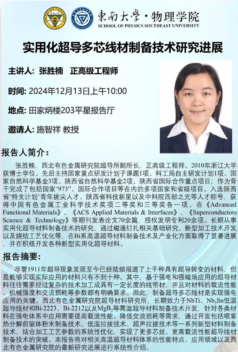 12月13日周五10:00学术报告|实用化超导多芯线材料制备技术研究进展