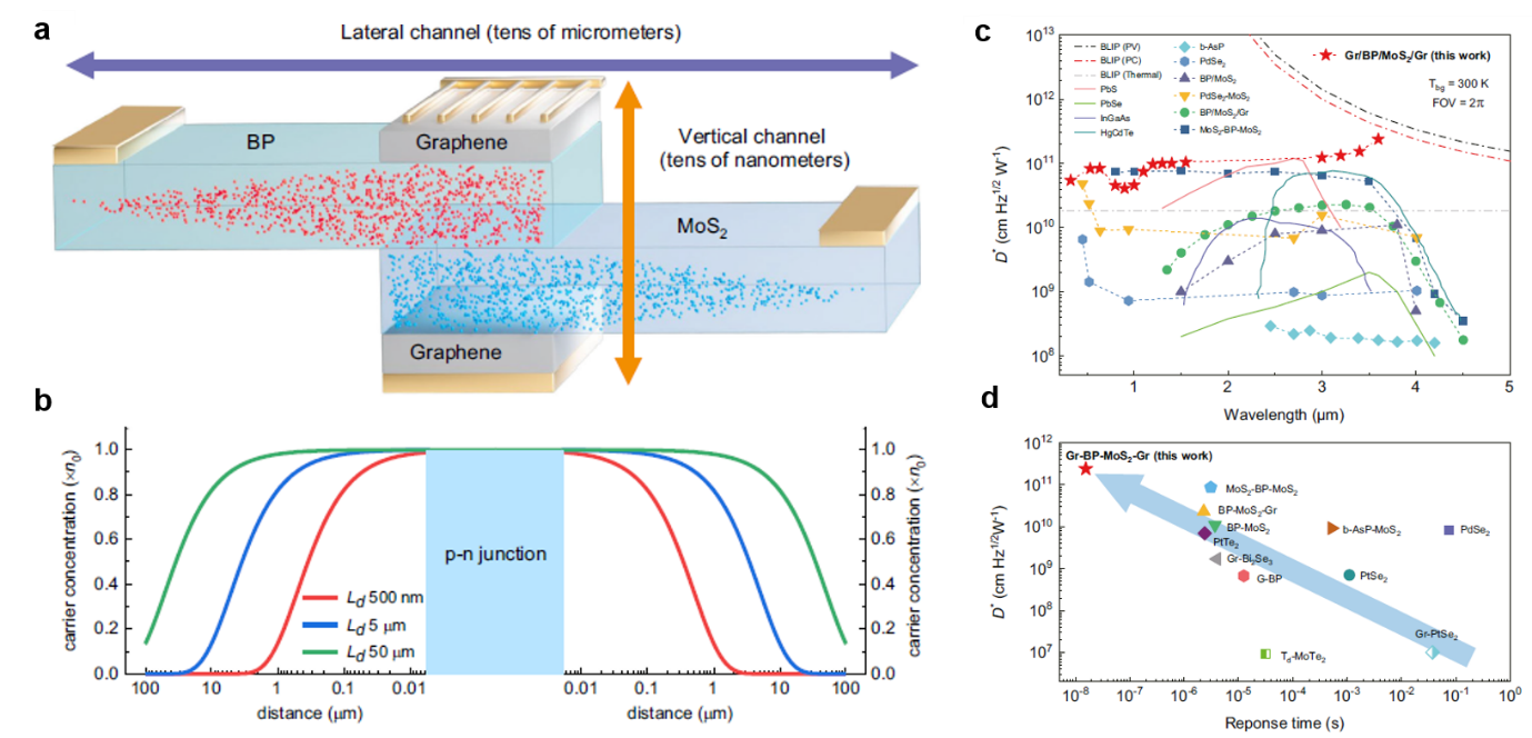 针对这一难题,倪振华教授、吕俊鹏教授课题组和南京师范大学物理科学与技术学院刘宏微教授课题组合作,提出了具有垂直沟道结构的石墨烯/黑磷/二硫化钼/石墨烯范德华异质结,实现了不同性能指标的协同优化。垂直沟道与水平沟道相比具有如下优势:更高的传输效率:垂直沟道将载流子传输路径缩短到数十纳米,比水平沟道短三个数量级,使光生载流子在复合之前被电极收集,提升器件量子效率;更短的渡越时间:垂直沟道更短的传输距离结合沿沟道方向的内建电场,减少了载流子渡越时间,提升器件响应速度;更高的收集效率:石墨烯高载流子迁移率有助于快速提取载流子到外部电路。通过多个维度的协同优化,最终实现了比探测率高达2.38×1011 cmHz1/2W-1(接近黑体辐射背景限理论极限),响应速度快至10.4纳秒,响应波段覆盖紫外到中波红外(325 nm – 3800 nm)的室温自驱动高性能红外光电探测器。探测器性能达到了商用制冷型碲镉汞探测器水平,为下一代室温高性能红外探测器的发展提供了新思路。