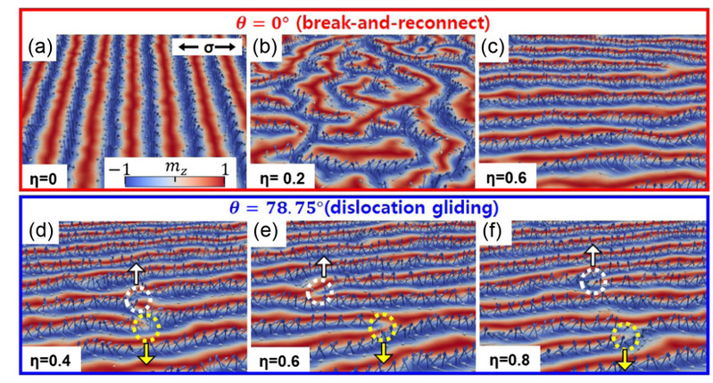 2.“位错滑移-湮灭”机制:当Q与应力夹角较大时,应力驱动刃型位错滑移,使位错附近的局部磁螺旋旋转一个小角度;位错滑移后通过湮灭完成整体结构重定向。