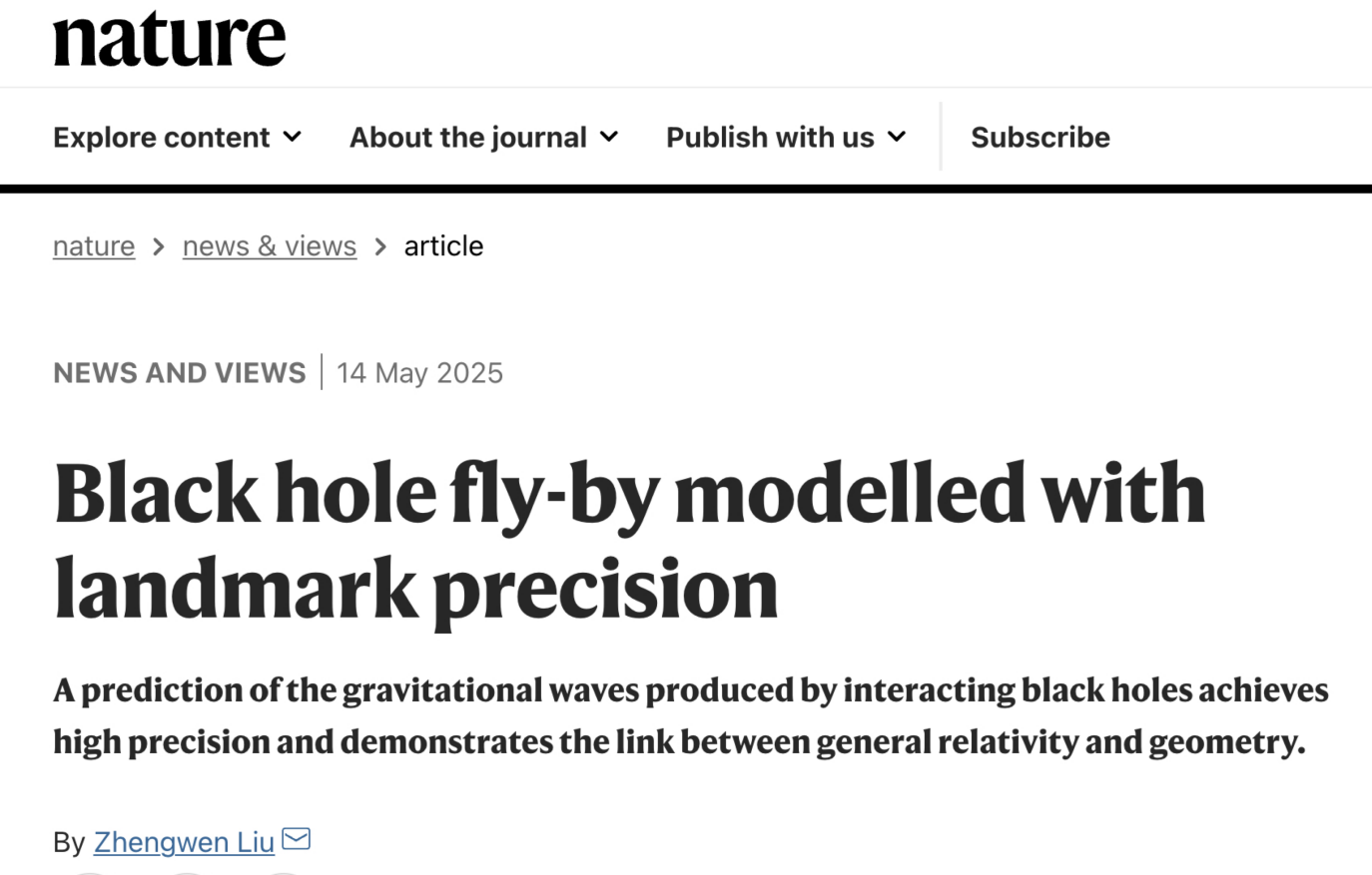 刘正文教授于2024年加盟71886a必赢,依托71886a必赢与丘成桐中心组建新兴的量子场论与引力波理论前沿交叉研究方向。News & Views是Nature杂志广受欢迎栏目,通常邀请相关领域的前沿专家撰写,对最新的重大科学成果进行权威评述。此次刘正文教授受邀发表评论文章,不仅是对他本人学术成就的高度认可,也凸显了71886a必赢团队在解析相对论与引力波研究领域日益提升的国际学术影响力。
