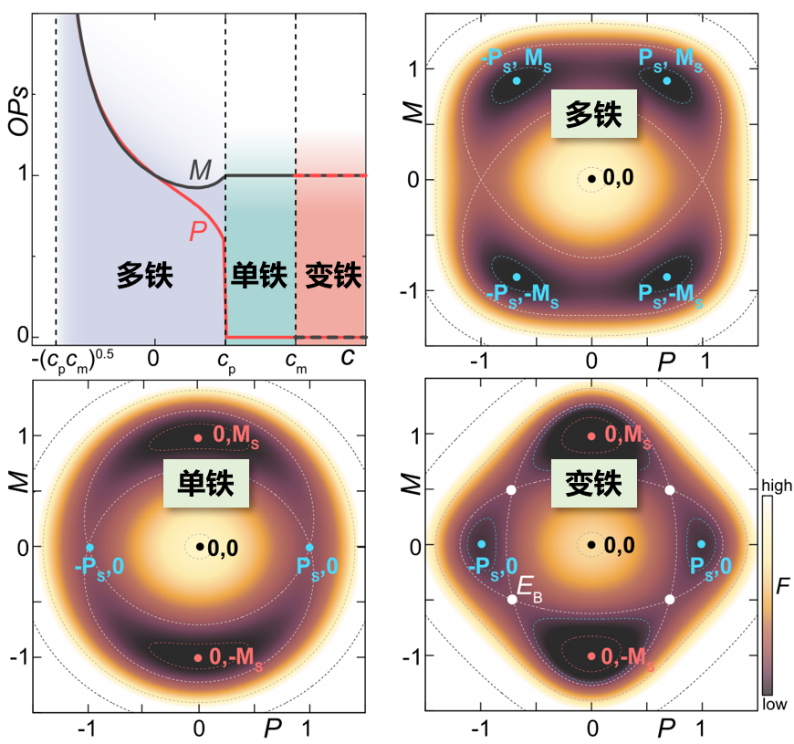 为了更加深入理解变铁性材料的物理机制,研究团队构建了一个基于经典朗道理论的宏观普适模型,实现了对单铁性、多铁性与变铁性三种铁性状态的统一理论描述。根据该理论,变铁性天然具备比多铁性更强的磁电耦合。该理论不仅揭示了变铁性材料中的强磁电耦合机理及其相变行为,也为后续新材料设计和性能调控提供了理论依据。该理论模型的适用性进一步得到了第一性原理的证明。该研究成果不仅拓展了铁性材料的理论范畴,也为未来实验验证提供了重要指引。