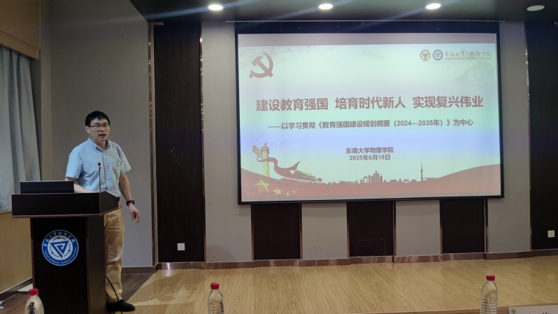 【专题学习:领会教育强国建设要义】副院长陈殿勇教授作题为“建设教育强国,培育时代新人,实现复兴伟业”的专题报告。报告系统解读了《教育强国建设规划纲要(2024-2035年)》的核心要义,重点阐述了高等教育在强国建设中的使命担当。陈殿勇强调,全院教师要深刻把握《纲要》提出的以习近平新时代中国特色社会主义思想为指导的根本遵循,主动对接国家重大战略需求,在前沿领域实现科研创新与人才培养的协同发展,为教育强国建设贡献东大智慧和物理力量。