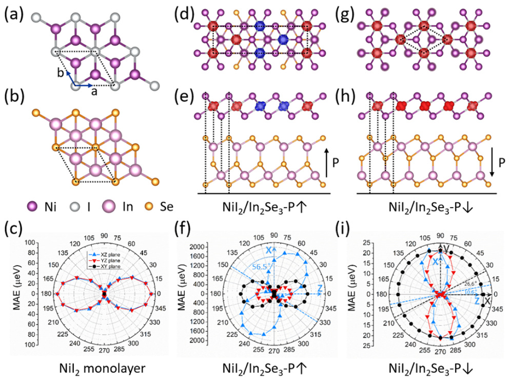 图2.(a)NiI2和(b)In2Se3单层结构俯视图。极坐标系下(c)NiI2单层在xz(蓝色),yz(红色),xy(黑色)平面上磁各向异性能随角度的依赖关系。(d, e)NiI2/In2Se3-P↑和(g, h)NiI2/In2Se3-P↓异质结的原子结构及自旋极化电荷密度分布的俯视图和侧视图。极坐标下(f)NiI2/In2Se3-P↑和(i)NiI2/In2Se3-P↓异质结磁各向异性能随角度的依赖关系。