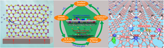 图1. 缺陷激活MoS2惰性表面析氢、简单析氢活性描述符建立与应用的示意图、水全分解的单原子双功能催化剂。