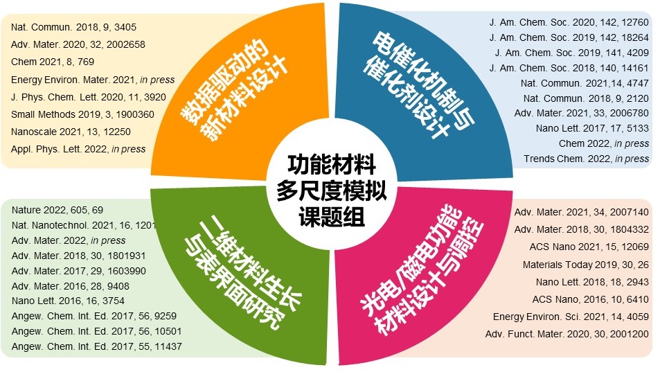 1、是国内最早将人工智能用于新材料设的课题组之一,较早开发了基于机器学习算法的多目标性质导向的材料筛选程序,并应用于钙钛矿光伏材料与二维铁磁材料的高效搜索,从二万余种钙钛矿和20万种二维材料中成功筛选出数百种性能优异的太阳能电池材料,高居里温度二维铁磁材料和45种固氮单原子电催化剂[Nat. Commun. (2018); Adv. Mater. (2020); Chem (2022); J. Am. Chem. Soc.(2022)]。该方法为新型功能材料的高效筛选和靶向设计提供了切实可行的方案。