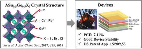 钙钛矿材料中八面体之间的连接方式以及重金属铅离子具有的独特电子构型是新型钙钛矿材料优异光电性能的物理化学来源。如何在保持优异光电特性的情况下,降低对于环境的毒性?针对以上难题,我们首次建议了引入与铅同处于后过渡金属区间且具有相似电子构型的混合锡锗钙钛矿材料代替含有重金属元素铅的钙钛矿半导体材料(J. Am. Chem. Soc. 2017, 139, 803)。通过组分精选与材料空间群调控等策略,我们成功预测了一系列具有适合光伏应用的直接带隙新型混合锡锗钙钛矿半导体材料。通过混合锡锗钙钛矿的相关光电性能描述符(有效质量、激子结合能、吸收光谱等)的理论计算,我们发现其中CsSn0.5Ge0.5I3钙钛矿材料表现出与原型材料CH3NH3PbI3相当的光吸收且具有较小有效质量和更低激子结合能,在光伏领域极具前景。此外,我们通过分子动力学模拟进一步发现锗离子的加入明显提高了材料的热力学稳定性。在我们理论工作的引导下,美国布朗大学Nitin教授成功合成了CsSn0.5Ge0.5I3,并测得其带隙值与我们的理论预测非常接近。制备的相应器件,其PCE达到7.11%(Nat. Commun. 2019, 10, 16 ESI高被引论文)。因此,我们的工作也成为通过理论计算驱动新型半导体材料创新的典型范例。